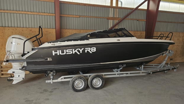 Vi har nu möjligheten att förmedla denna tuffa Finnmaster Husky R8 med en härlig Yamaha 300hk V6 som endast gått 55 tim. Här får man en båt som tål tuffa tag men som man också kan glida runt och bara njuta av härliga sommardagar med. Man bäddar snabbt ner till en stor solsäng i akter.